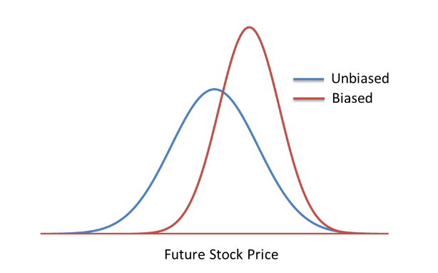 Researchers have identified over 100 different cognitive biases that affect estimation and prediction. It is impossible to distinguish between these different biases individually by calibrating probabilistic assessments. However, some have observed that, for continuous assessments, all these biases can be boiled down to two principal biases—confidence bias and directional bias (McVay and Dossary 2014, Alarfaj and McVay 2020). Confidence bias relates to the uncertainty of the estimate, i.e., the width of the distribution. Directional bias relates to the central value of the estimate, i.e., the directional shift of the distribution. The following figure shows an unbiased continuous probability distribution of future stock price (blue) and a biased distribution of the same stock price (red) that is both overconfident (is too narrow and thus underestimates uncertainty) and positively biased (is shifted to the right). If one has a personal stake in the estimate (e.g., if one owns this stock), then this positive directional bias could be considered optimism bias.