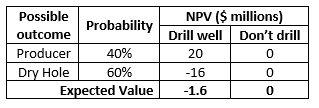 A decision consists of choices, uncertain outcomes and probabilities, and values (payoffs) associated with each combination of choice and uncertain outcome. A simple decision for drilling a well is shown in the following table. For simplicity in this example, the uncertain outcome of drilling the well is considered to have only two possibilities—producer vs dry hole.