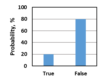 To answer a discrete question, you assign probabilities to all the possible choices such that the probabilities sum to 100%. You should assign probabilities that correspond to your relative certainty about the different choices. For example, if you are reasonably, but not completely, sure the correct answer to the discrete training question “Iron is denser than gold; True or False?” is False, you might assign 20% probability to True and 80% probability to False (figure below). If you are completely unsure, i.e., you have absolutely no knowledge about the choices, then you should assign equal probabilities—50% to each choice for a true-false question and 25% to each choice for a 4-choice multiple-choice question. When you are satisfied with your probability selections, hit the green Submit button to submit your answers.