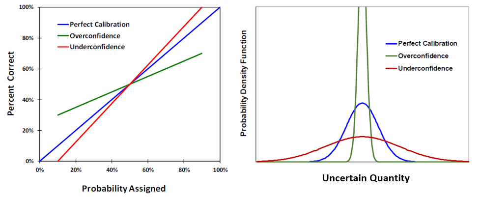 For continuous probabilistic assessments, overconfidence bias results in distributions that are too narrow (red curves in figure below), while directional bias (e.g., optimism or pessimism) shifts the distribution directionally.