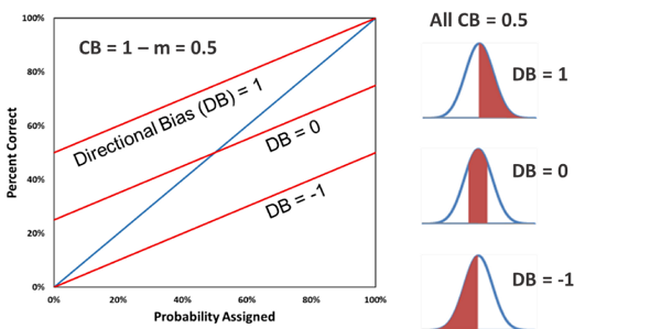 Directional bias (DB) is a quantitative measure that, for continuous probability assessments, indicates both the direction and degree of the shift of the estimated distribution relative to an unbiased distribution. DB is calculated from both WLS slope and WLS intercept, the slope and intercept, respectively, of the weighted-least-squares straight-line fit of the raw calibration curve. DB is also defined so that a value of zero is ideal. DB ranges from -1 (complete negative directional bias) through 0 (unbiased directionally) to 1 (complete positive directional bias). If the assessor has a personal stake in a value-based assessment (e.g., estimation of the future price of a stock which the assessor owns), then positive DB would be optimism bias and negative DB would be pessimism bias. If the assessor has a personal stake in a cost-based assessment (e.g., estimation of the cost to repair a car which the assessor owns), then negative DB would be optimism bias and positive DB would be pessimism bias. Additional details on the model for calculating confidence bias and directional bias can be found in McVay and Dossary (2014) and Alarfaj and McVay (2020).
