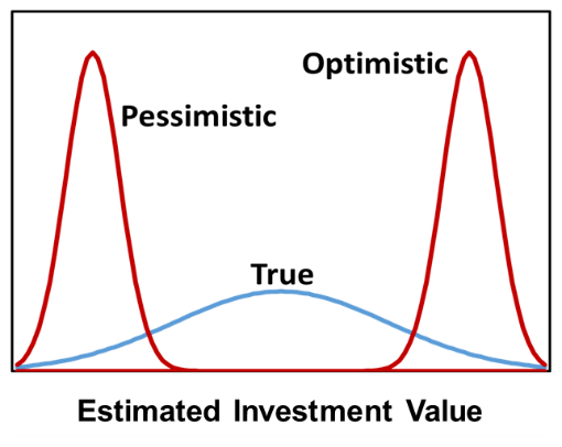 If we are making decisions with unreliable uncertainty assessments, we will sometimes, if not often, make poor decisions. In general, if we are overconfident and optimistic (figure below), we will invest in some investments that we should not invest in. Likewise, if we are overconfident and pessimistic (figure below), we will not invest in some investments that we should invest in, resulting in missed opportunities.