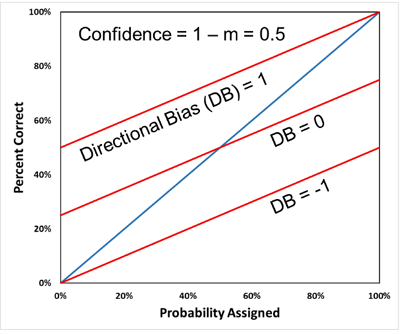 We can also measure directional, or optimism-pessimism, biases from the intercept of the calibration plot. In the figure below, we show that we can measure confidence and directional biases quantitatively. Confidence bias (CB) ranges from -1 (complete underconfidence) through 0 (unbiased) to 1 (complete overconfidence, or a point estimate). Directional bias (DB) ranges from -1 (complete negative directionally, which is pessimism for value-based assessments) through 0 (unbiased directionally) to 1 (complete positive directionally, which is optimism for value-based assessments). See McVay and Dossary (2014) and Alarfaj and McVay (2020) for more detail on these concepts.