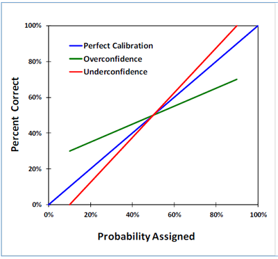 The reliability of probabilistic assessments can be expressed on a calibration plot (figure below). A group of probabilistic assessments are unbiased, or perfectly reliable, if the calibration curve falls on the unit-slope line (blue). A slope less than 1 indicates overconfidence (green). For example, for a group of P90 assessments, the actual value was less than the P90 estimate only 70% of the time (the analyst was overconfident by estimating the actual value would be less than the P90 value 90% of the time rather than 70%). Underconfidence (overestimation of uncertainty) is indicated by a slope greater than 1 (red). However, underconfidence is rare.