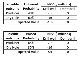 For discrete probabilistic assessments, overconfidence and optimism results in overestimation of the probability of a desirable outcome. In a well-drill decision, instead of an unbiased 40% probability of a producer, overconfidence and optimism biases might result in the analyst assigning a 65% probability of a producer (figure below).