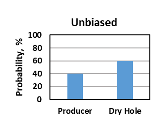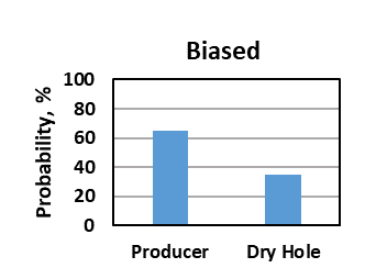 For discrete probabilistic assessments, overconfidence and optimism results in overestimation of the probability of a desirable outcome. In a well-drill decision, instead of an unbiased 40% probability of a producer, overconfidence and optimism biases might result in the analyst assigning a 65% probability of a producer (figure below).